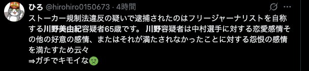 我孫子署によると、川野容疑者は「逮捕状に記載されているメッセージを送った記憶はありません」と容疑を否認している。10月に中村選手の関係者から警察に相談があり発覚した。2人は面識がなかったといい、我孫子署が経緯を調べている。