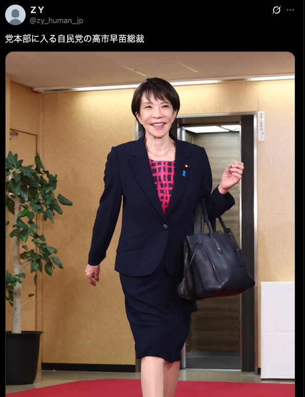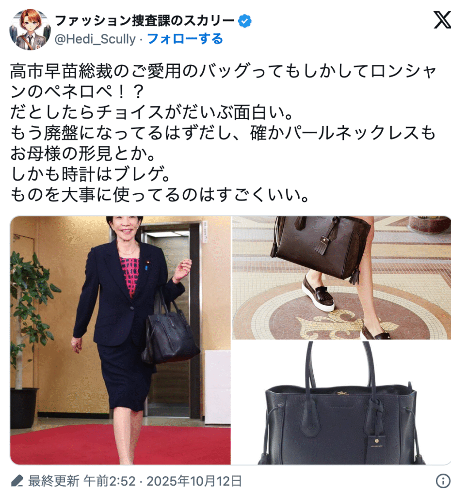 高市早苗が総理就任後に見せた黒いバッグが上品で素敵と SNS で話題になりました。