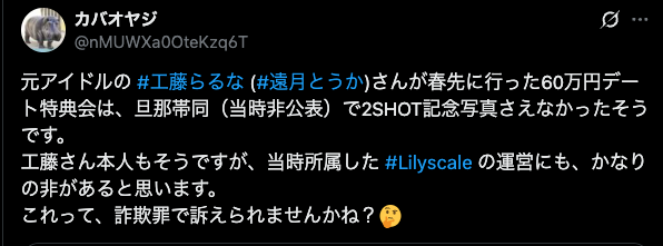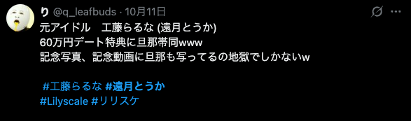 2025年10月10 遠月とおかが提供した 60万円の高額ディズニーデートを提供した際に同行したスタッフが実は遠月とうか の旦那疑惑が浮上しました。025年10月10日、X上で一部ファンが、遠月とうかが提供した“60万円ディズニーデート特典”の際、同行したスタッフが実は彼女の夫だったのではないか、という疑惑を投稿。