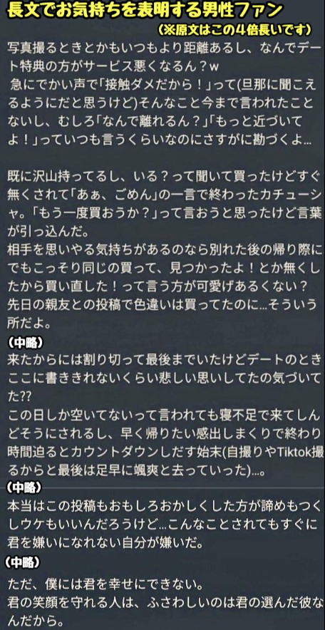 投稿によれば、デートにはチケット、食事、記念撮影が含まれており、“恋人気分”を演出する内容だったとのことですが、記念撮影で夫と思われる男性が写っていた、あるいは彼女との親密なやり取りが見られた、という指摘がなされています。