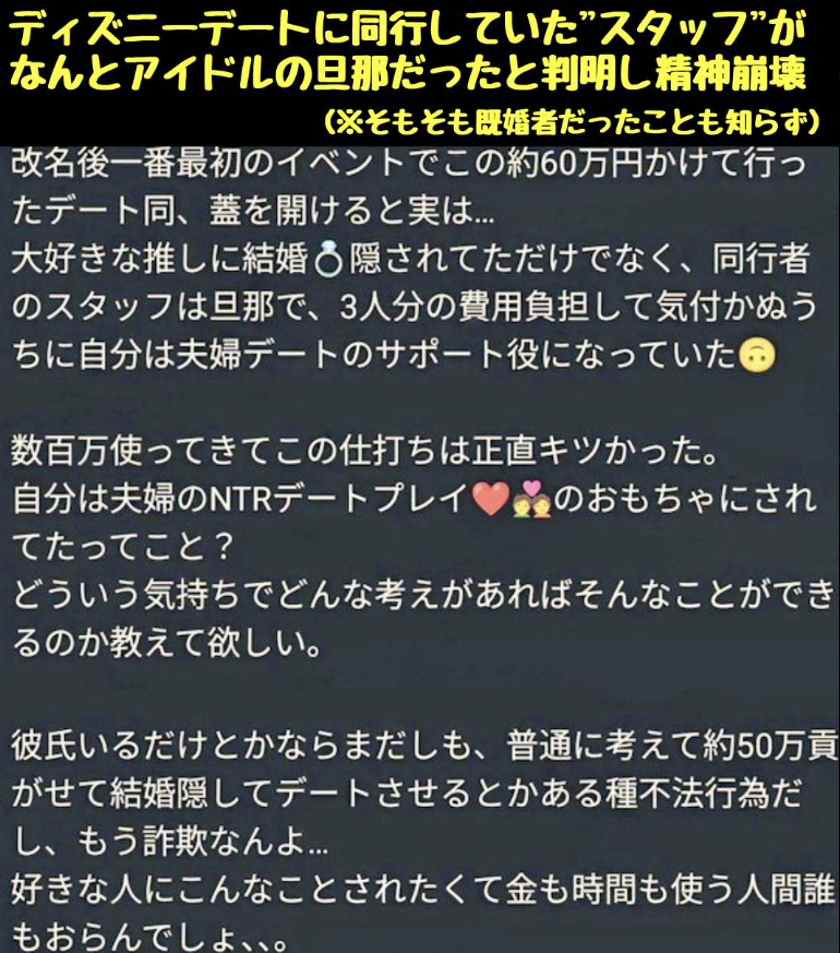 近年、結婚隠し疑惑や「60万円ディズニーデート特典」での夫同伴説がX上で大きな話題になりました。